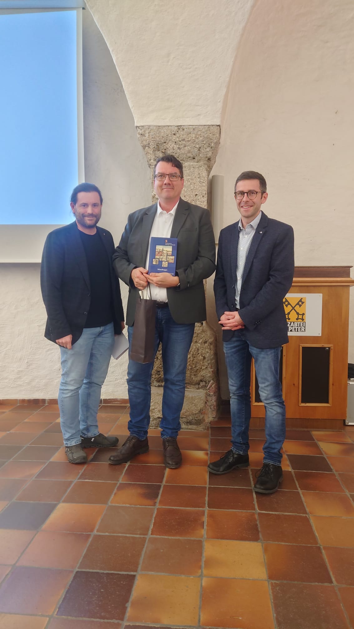 Beim Vortragsabend vom 25. Februar wurde der soeben im Verlag Anton Pustet erschienene Landeskunde-Band 164/165 den anwesenden Vereinsmitgliedern präsentiert. Inhaltlich spannt sich der Bogen des 456 Seiten starken Werks von der Salzburger Schulgeschichte über historiografische, kunstgeschichtliche, militärgeschichtliche Themen bis zu biografischen Beiträgen vom Mittelalter bis ins 20. Jahrhundert. Im Rahmen der Präsentation wurde der Band von Schriftleiter Mag. Wolfgang Neuper und dem neuen Präsidenten Dr. Gerald Hirtner an Dr. Thomas Mitterecker überreicht, dem dieser Band gewidmet ist. Dr. Thomas Mitterecker ist der Leiter des Archivs der Erzdiözese Salzburg und war von 2015 bis 2024 Präsident der Gesellschaft. Diese Widmung ist ein Zeichen des Dankes für seinen unermüdlichen Einsatz in all diesen Jahren. Die Neuerscheinung wird aktuell an alle Mitglieder versandt und kann darüber hinaus bei der Gesellschaft für Salzburger Landeskunde zu den Bürozeiten erworben werden (Impressum – Landeskunde Salzburg).
